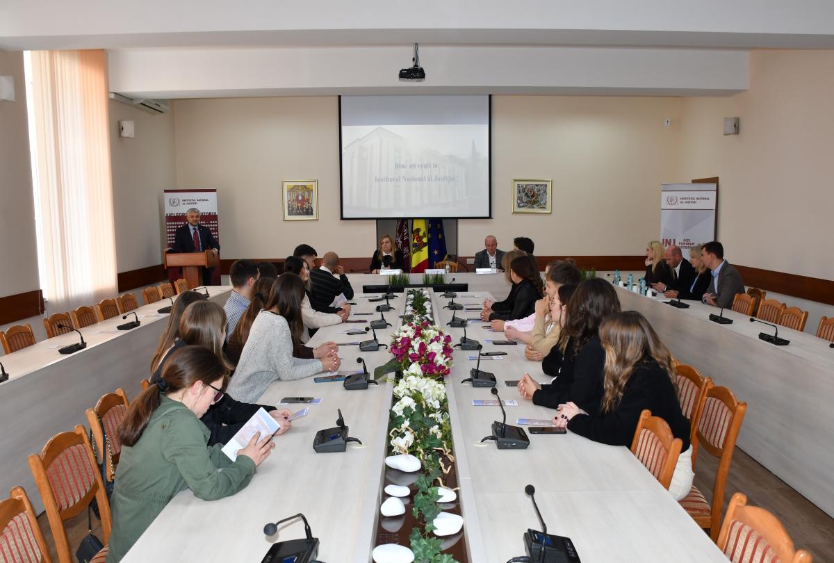 In order to better understand the purpose and role of the INJ in the training of future judges and prosecutors, the visitors interacted with the Interim Director of the INJ, Adrian Cerbu, with the head of the Initial Training Section, Iulia Gorbatenco, as well as with the INJ graduates – Eleonora Badan-Melnic, judge at the Center Court, Octavian Bivol, prosecutor in the Chisinau Municipal Prosecutor's Office, Doina-Cezara Galasîn and Cătălin Lîi, candidates for the position by the prosecutor.