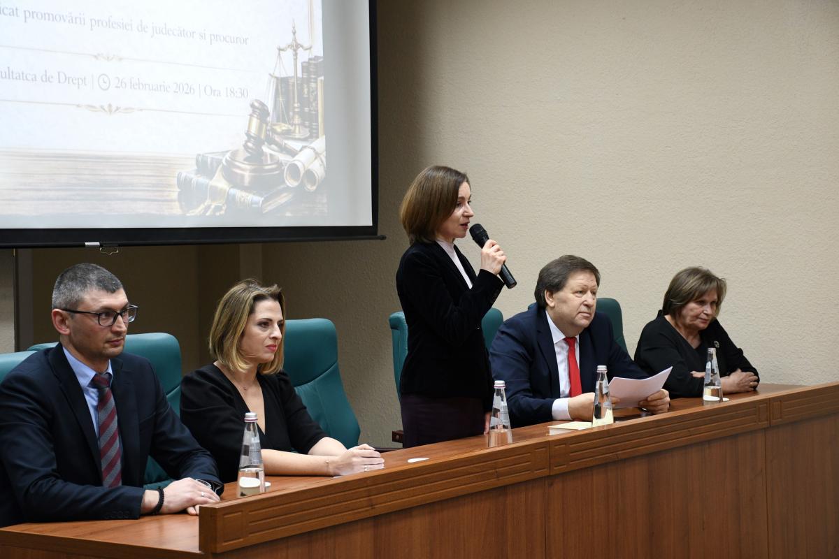 These were just some of the questions asked by the first and second year master's students to the special guests of the "Career in the judiciary and prosecutor's office - vocation, integrity and professionalism" event. The meeting, organized at the State University of Moldova and moderated by the dean of the Faculty of Law, Sergiu Băieșu, brought together the President of the country, Maia Sandu, the leadership of the National Institute of Justice, represented by director Ramona Strugariu and deputy director Ghennadi Epure, as well as retired judge Maria Ghervas. They all had a common goal: encouraging the new generation to embrace the career of judge or prosecutor.