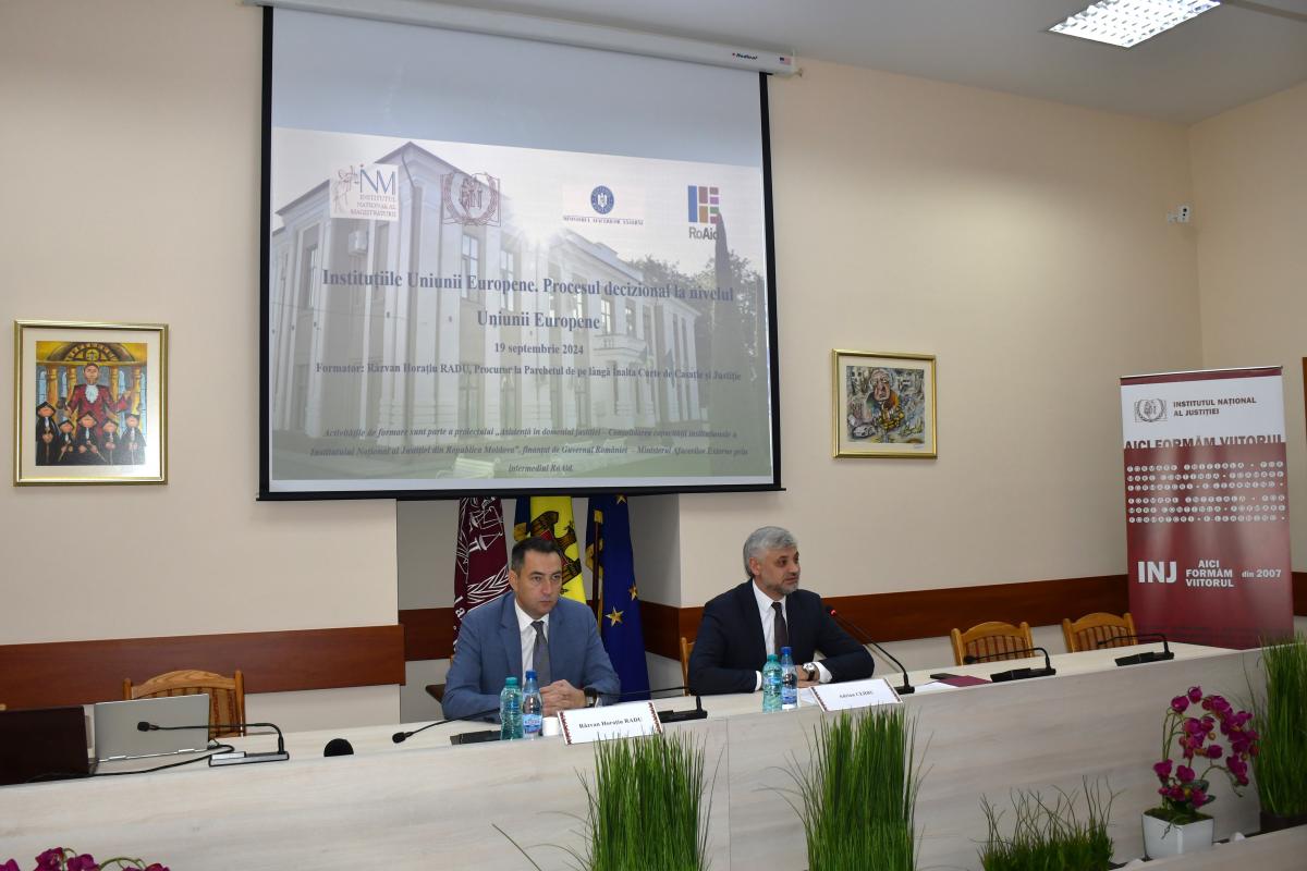 Aprofundarea cunoștințelor viitorilor judecători și procurori cu privire la instituțiile și procesele decizionale ale Uniunii Europene, precum și la rolul fundamental al statului de drept în comunitatea europeană este scopul a două sesiuni de formare care se desfășoară în perioada 19-20 septembrie 2024, la Institutul Național al Justiției. Acestea sunt primele activități realizate în cadrul noului proiect „Asistență în domeniul justiției – Consolidarea capacității instituționale a Institutului Național al Justiției din Republica Moldova”, implementat de Institutul National al Magistraturii (INM) din România și Institutul Național al Justiției (INJ) din Republica Moldova, finanțat de Guvernul României – Ministerul Afacerilor Externe prin intermediul Agenției de Cooperare Internațională pentru Dezvoltare (RoAid).