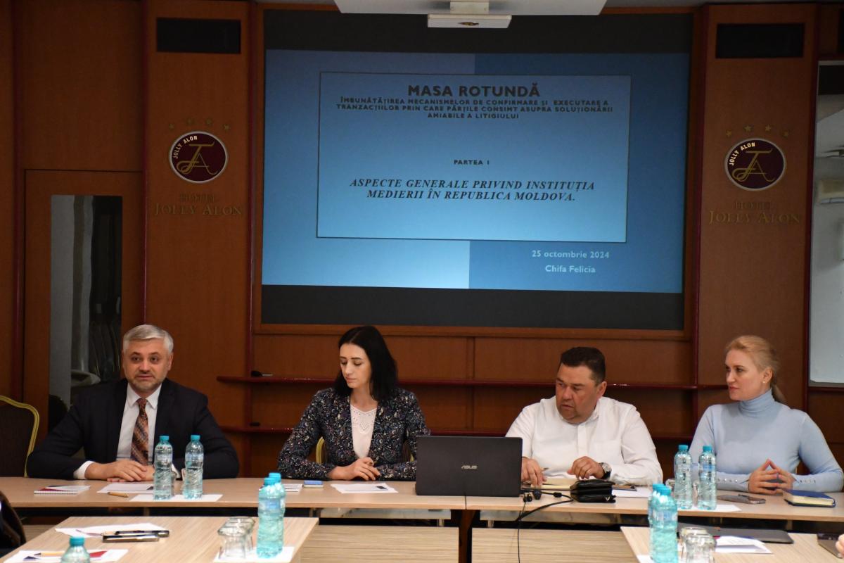 The National Institute of Justice and the Mediation Council, with the support of USAID Moldova, organized, today, October 25, 2024, a round table with the generic theme "Improving the mechanisms for confirming and executing transactions through which the parties agree on the amicable settlement of the dispute".
